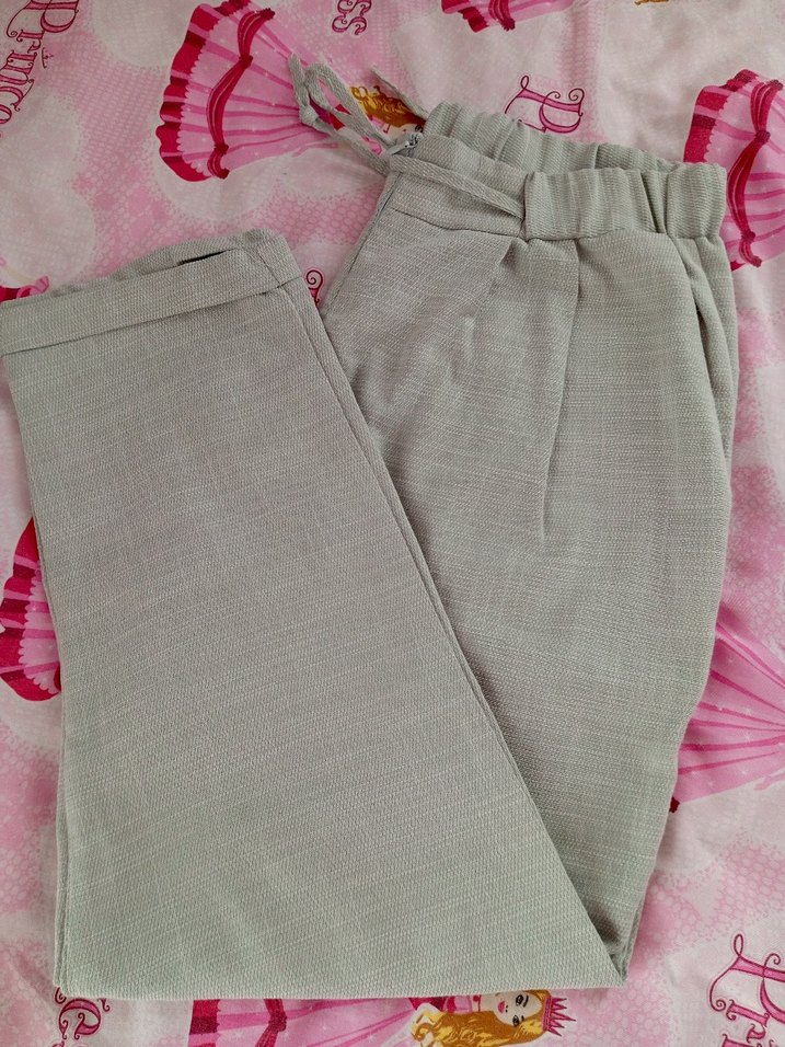 Kadınlar için keten kumaştan, pilili ve normal midi boyda, rahat kesim bej pantolon. Günlük kullanıma uygundur.