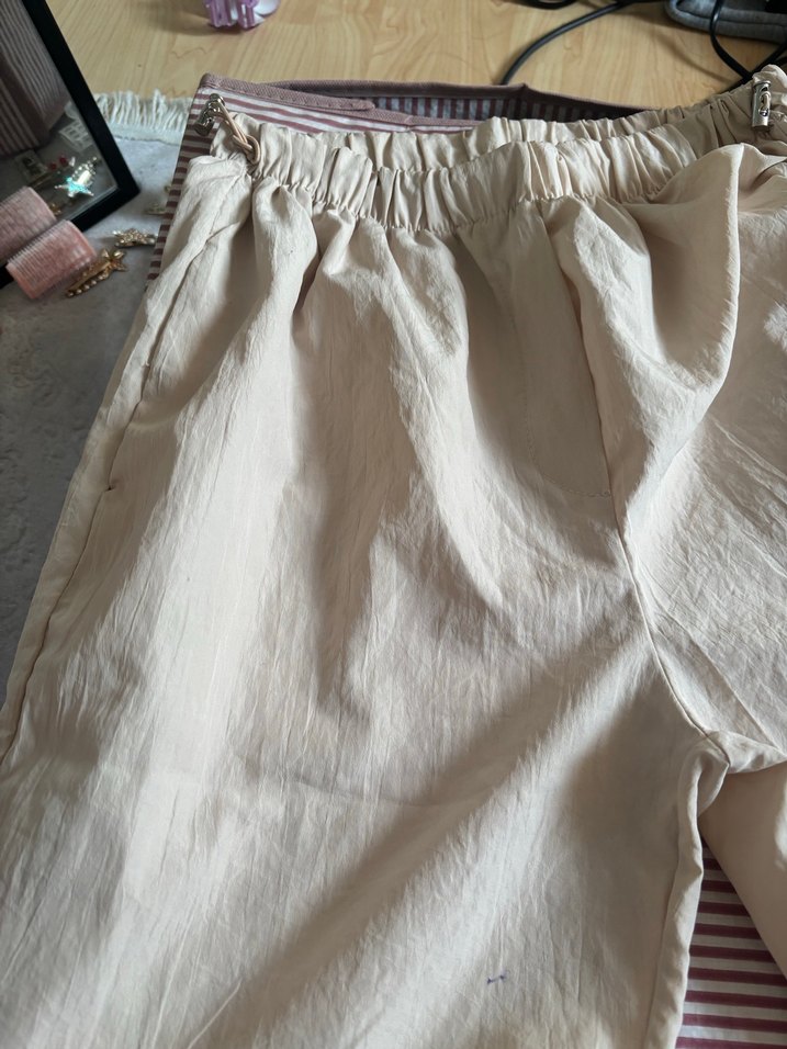 Bej keten kumaştan, pilili ve bol kesim midi uzunluğunda kadın pantolon. Minimalist ve bohem tarzda, günlük rahat kullanım için uygundur.