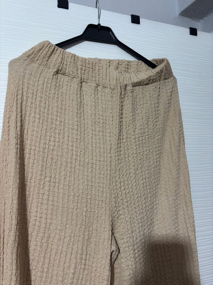 Bol kesim, piliseli detaylı, lastikli bel kısmına sahip bej keten pantolon, günlük kullanıma uygun sade ve rahat tarz sunar.