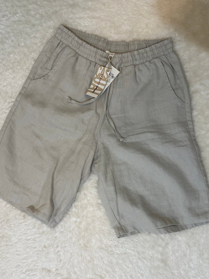 Bej renk keten kumaştan, salaş kesimli, belden lastikli ve bağcıklı rahat bermuda şort. Günlük sokak stili için uygundur.