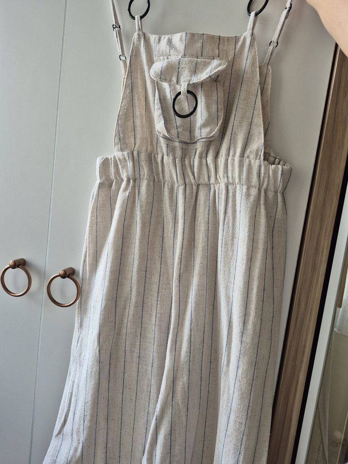 Bol kesim, uzun boy, ince askılı keten tulum. Minimalist ve bohem tarzda, tokalı detaylı bej renk.