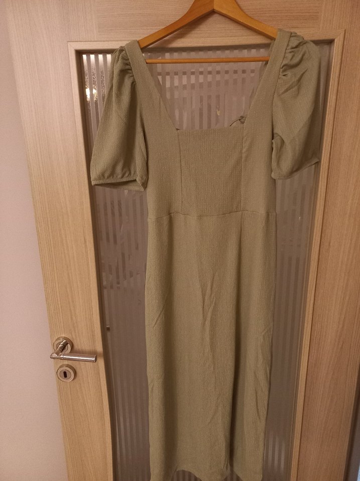 Bej renkli, keten kumaştan yapılmış, kısa kabarık kollu ve kare yaka, vücuda oturan uzun elbise. Minimalist sokak stili için uygun, pilili detaylar içerir.