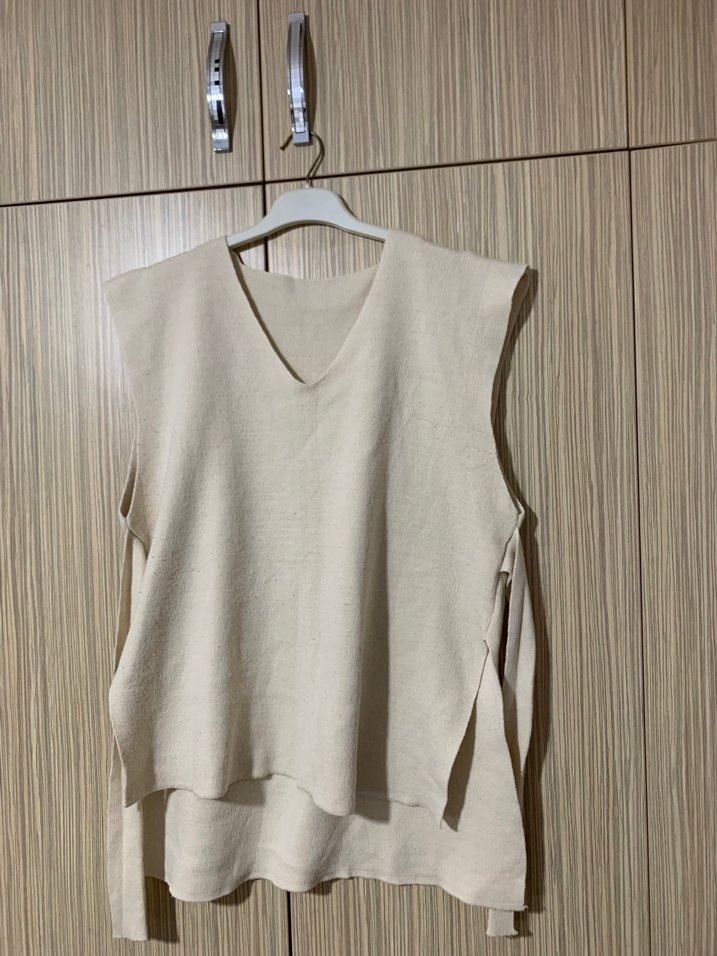 Bej keten kumaştan, V yaka ve kolsuz tasarıma sahip, normal boyda ve bol kesim kadın süveter. Minimalist ve zahmetsiz şıklık sunar.