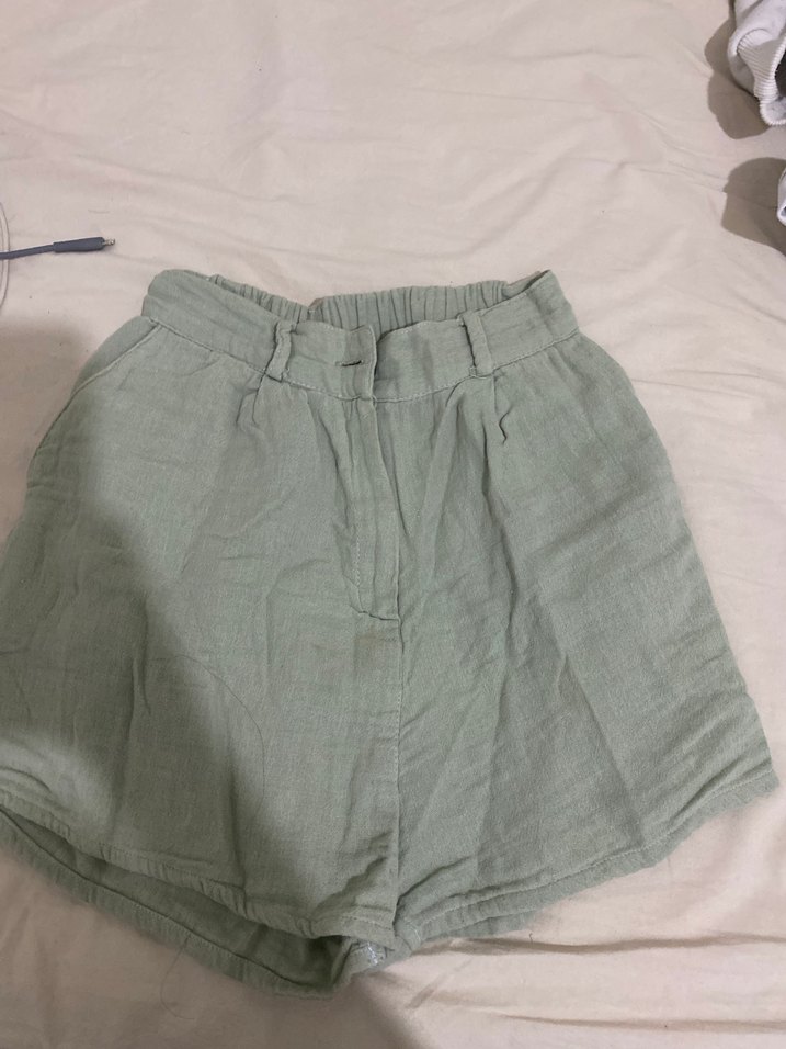 Kadınlar için bej keten, yüksek bel, bol kesim mini şort. Minimalist, desensiz tasarımıyla günlük kullanıma uygun, zahmetsiz şıklık sunar.