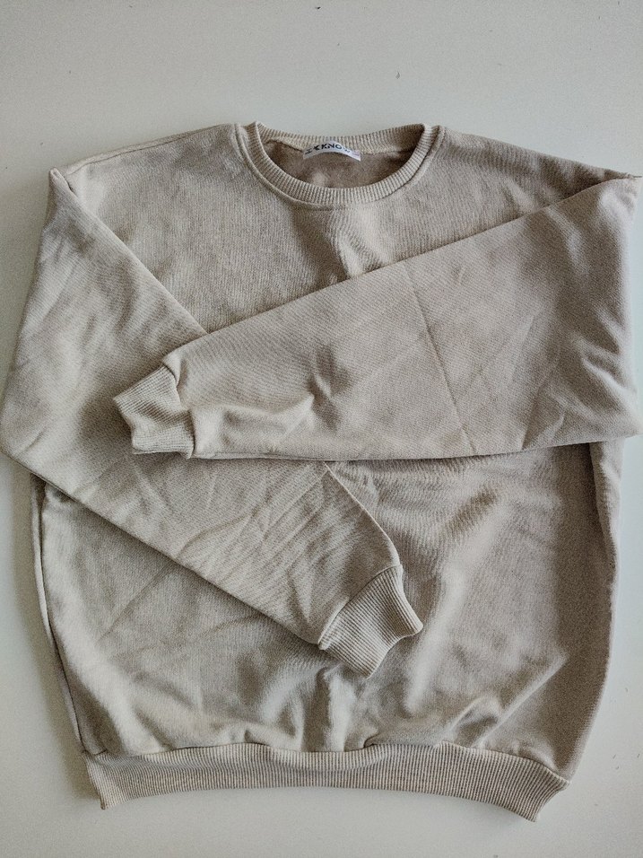 Kadınlar için bej keten kumaştan, yuvarlak yaka ve uzun kollu sweatshirt. Rahat kesimi ve sade deseniyle günlük kullanıma uygundur.