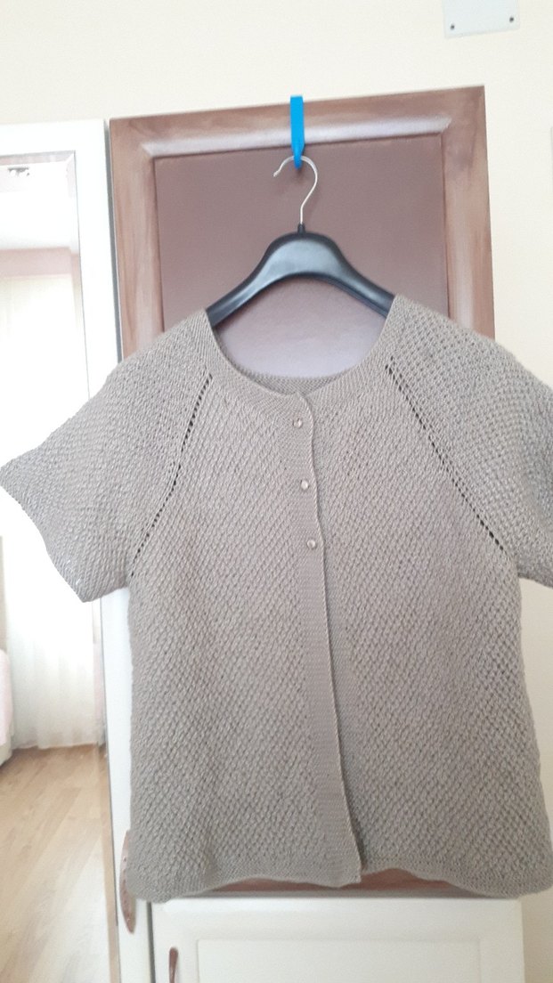 Bej renkli, kısa kollu ve yuvarlak yakalı örme hırka. Rahat kesimi ve midi boyu günlük kullanıma uygundur.el orgüsudur