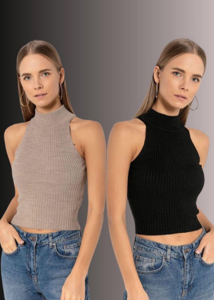 Kolsuz, yüksek yakalı ve vücuda oturan bej renkli örme kumaştan kısa crop top. Günlük kullanıma uygun, rahat ve şık bir parça. Bedenlerimiz mevcut