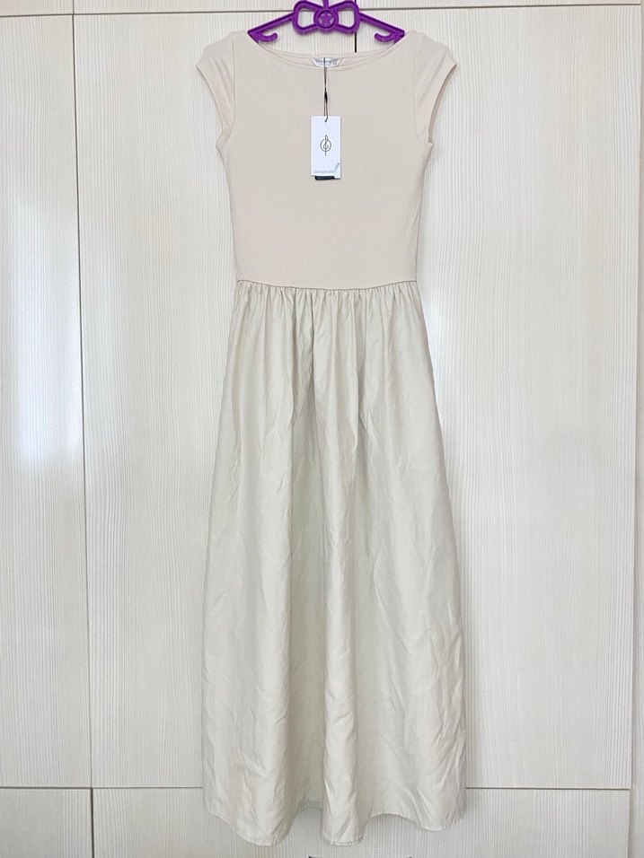 Bej renkli, kolsuz midi elbise; yuvarlak yaka ve bol kesime sahiptir. Minimalist, desensiz tasarımıyla günlük kullanım için rahat ve şık bir seçenektir.