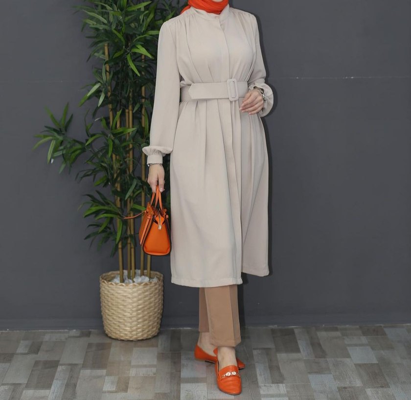 Yüksek yakalı ve uzun kollu, bej renkli, kuşaklı kadın trençkotu. Düz ve minimalist tasarımıyla günlük sokak stiline uygundur.