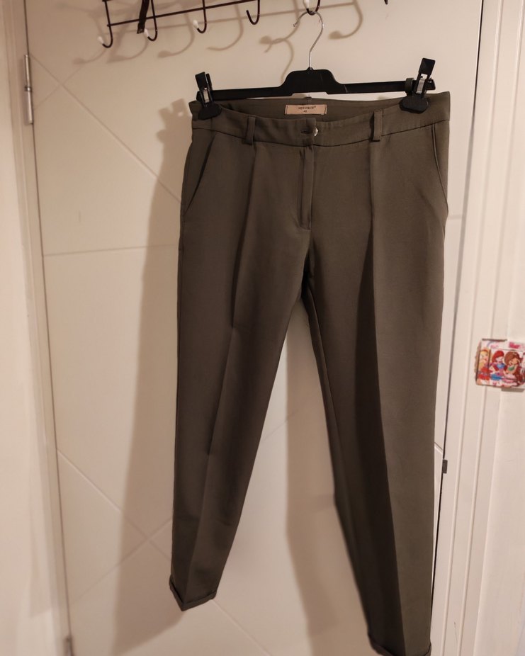 Kadınlar için bej kumaş pantolon, kemerli ve normal boyda. Düzenli kesim ve desensiz tasarımıyla ofis için uygun.