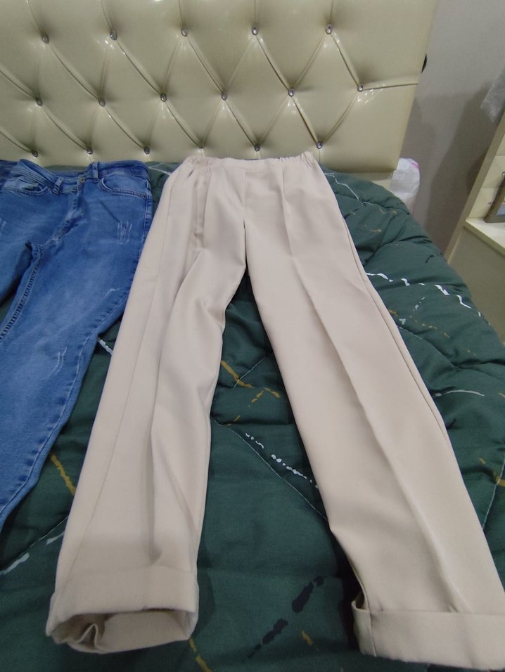 Bej renkli, pilili ve normal boyda, rahat kesimli kumaş pantolon. Yumuşak ve sıcak dokusuyla günlük sokak stiline uygun.