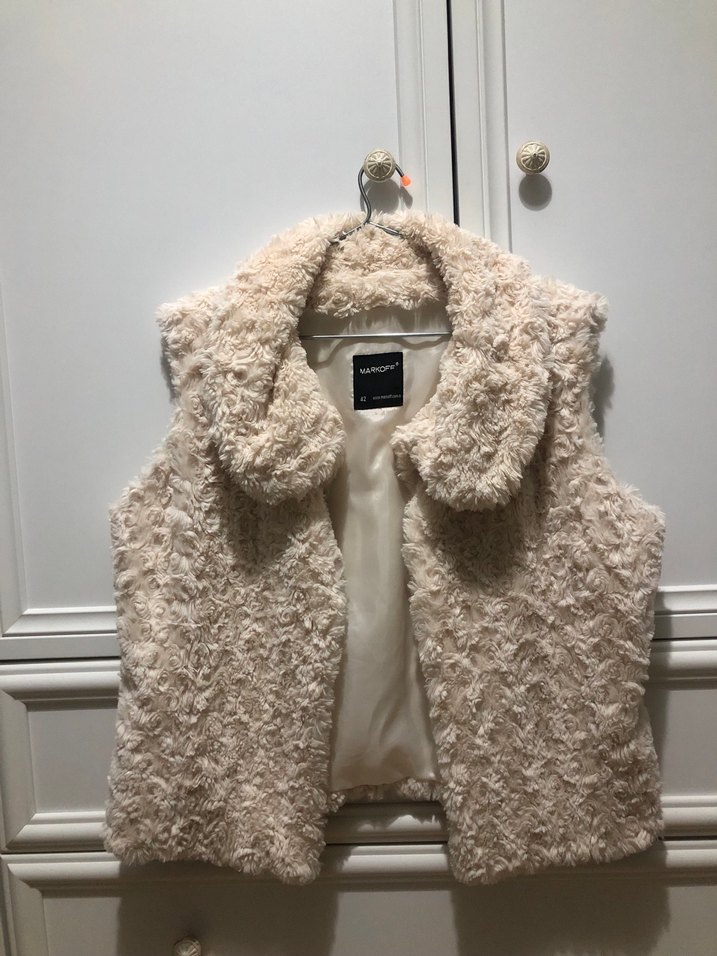 Bej renkli, kürk detaylı yakalı, kolsuz ve vücuda oturan kesime sahip midi uzunlukta yelek. Yumuşak ve sıcak kumaştan üretilmiştir, günlük ve sokak giyimi için uygundur.