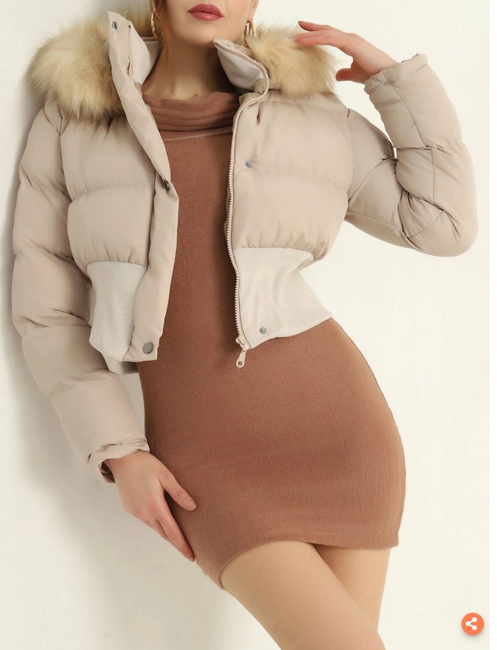 Kadın Bej Kürklü Kısa Kışlık Mont