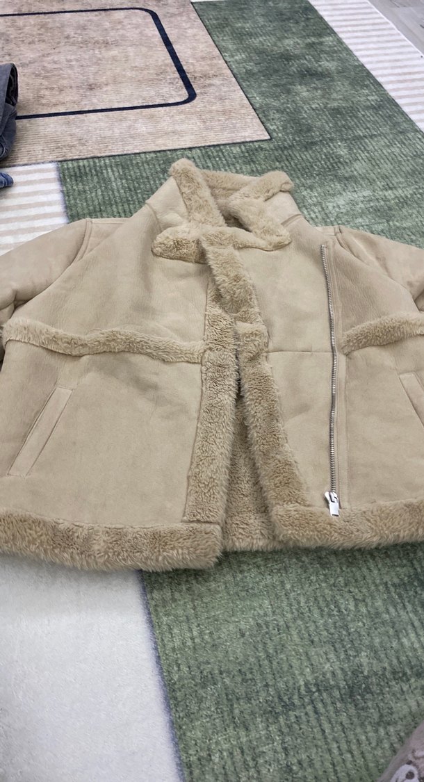 Bej renkli, kürk detaylı, uzun kollu ve kesik yaka kadın kışlık ceket. Yumuşak ve sıcak kumaştan, normal kesim ve midi boyda, sokak stiline uygun.