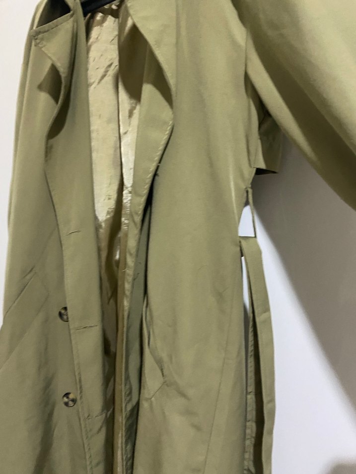 Kadın bej renginde, kuşaklı ve yakası kesik uzun trençkot. Sentetik kumaştan, bol kesim ve askılı kolludur. Günlük sokak tarzına uygun, Parisli avant-garde stilini yansıtır.