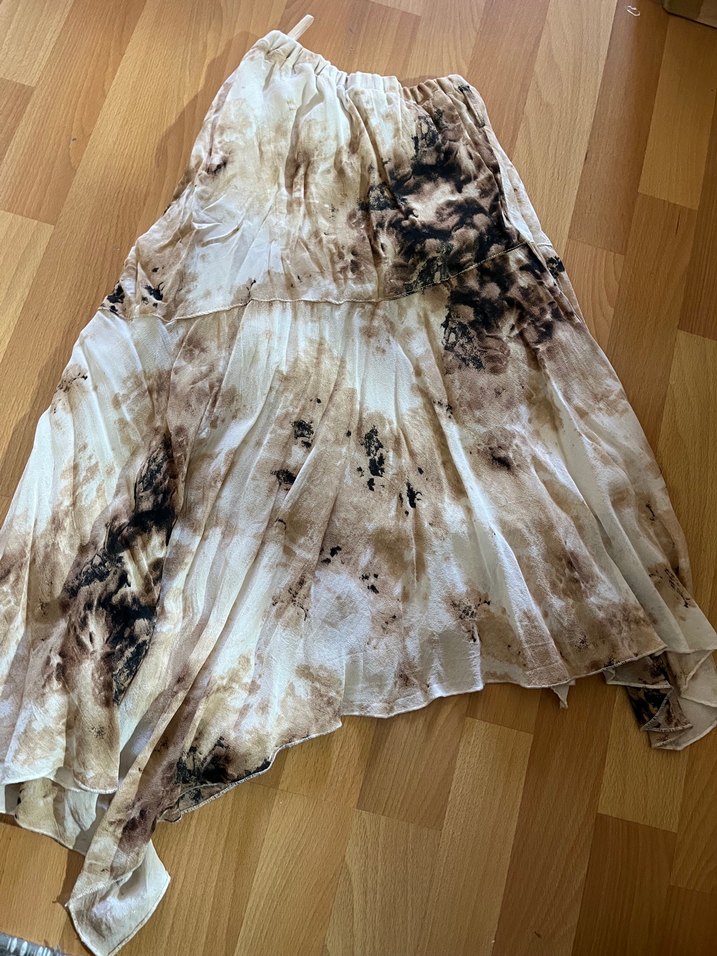 Kadınlar için uzun, bol kesim ve drapeli etek. Koyu bej bağlama desenine sahip, bohem tarzı yansıtır, dış mekanlar için uygun.
