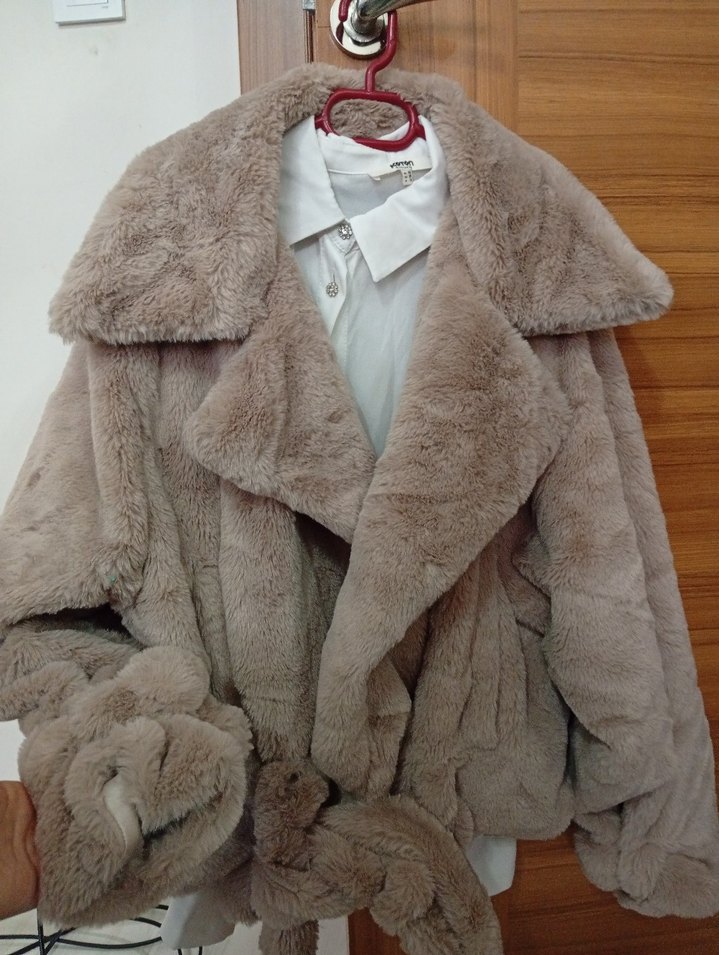 Bej renk, kürk detaylı, notched lapel yakalı ve uzun kollu rahat kesim kadın kaban. Yumuşak ve sıcak kumaştan, günlük sokak tarzı için uygun. içi astarlıdır çok sıcak tutar kol ve bel bağlama detaylı dır onu kapanıyor bel kemerını baglayınca bır kez gıydım 38 beden ama 42 de dahıl olur