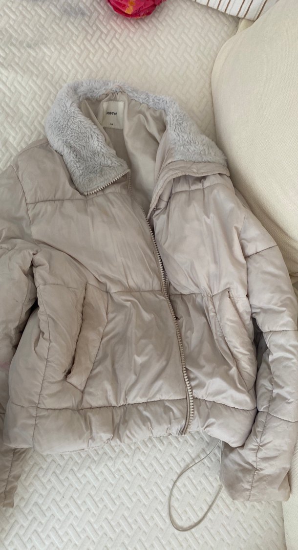 Kadınlar için bej renkte, yaka kısmı kürklü ve uzun kollu, midi boyda kışlık ceket. Yumuşak fleece kumaştan yapılmıştır, günlük kullanım için uygundur.