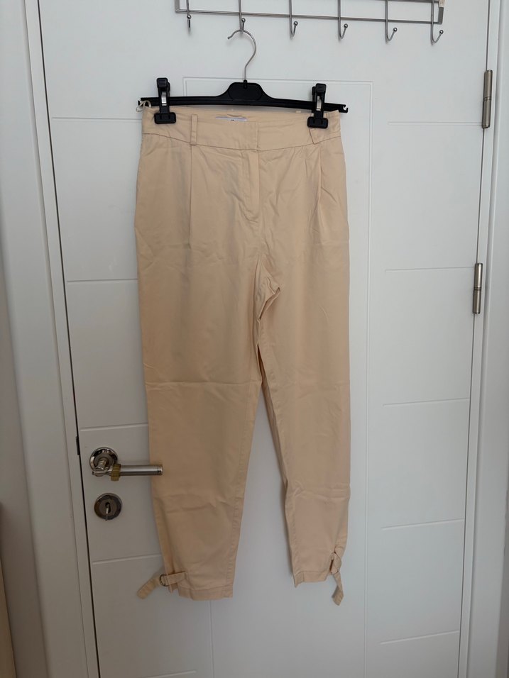 Bej sarımsı renkli, midi boy chino kadın yumuşak kumaş pantolonu. Düz ve şık tasarımıyla ofis ve günlük kullanımı için uygundur.