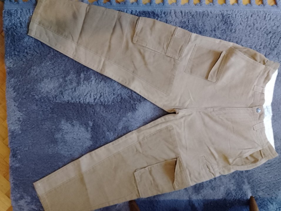 Bej midi uzunlukta kadın pantolon, sentetik kumaştan, bel kemeri ve cepleri ile rahat kesim, günlük açık hava kullanımı için uygundur. unisex kullanıma uygundur