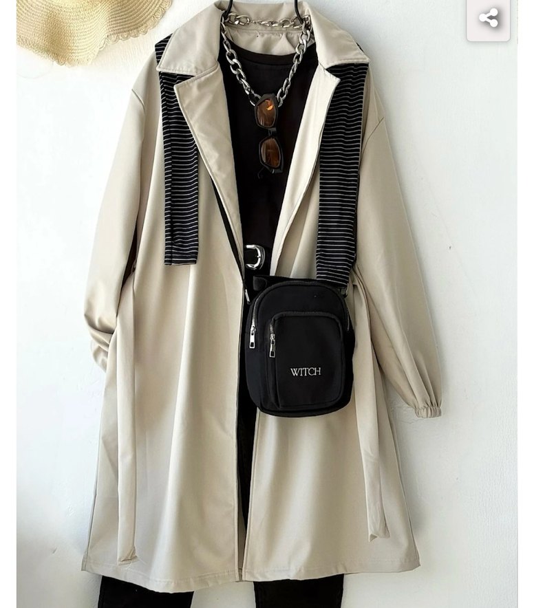 Bej midi uzunlukta, bol kesim, kuşaklı, kesik yakalı ve askılı kollu trençkot. Sentetik kumaştan, günlük kullanım için uygun. hiç giyilmedi