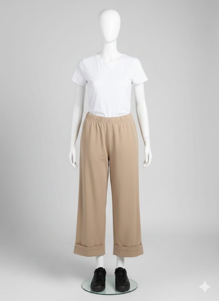 Bej renkli pamuklu pantolon, rahat kesim ve midi boy ile minimal ve zahmetsiz şıklık sunar, gündelik kullanım için uygundur.