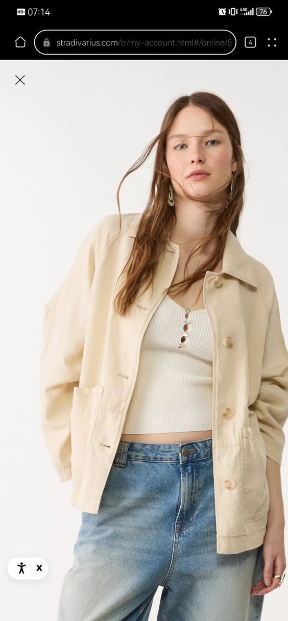 Kadın bej midi trençkot, pamuklu yumuşak kumaştan, bol kesim ve yakalı, uzun kollu, günlük rahat kullanıma uygun şık bir parça.