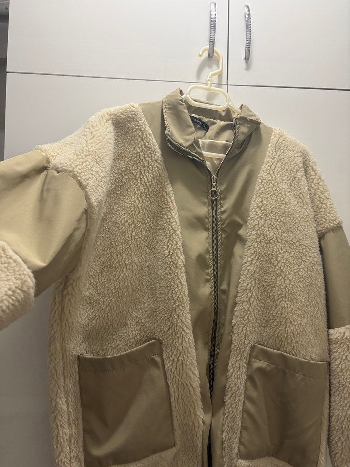 Kadın bej midi ceket, yüksek yakalı ve uzun kolludur. Yumuşak peluş ve düz kumaşın birleşimiyle rahat, bol kesimdir. Ön cepleri ve fermuarlı kapanışı vardır. İçi astarlı ve dışında peluş detayları olan moda bir cekettir. Ürün geniş kalıptır