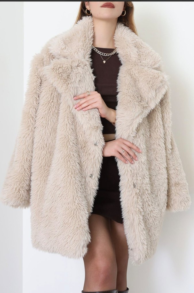 Bej renkte, suni kürk detaylı, notched lapel yakalı ve uzun kollu, rahat kesim midi ceket.