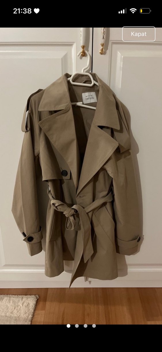 Bej renkli kadın trençkot, kesik yaka ve kemerli bel ile tasarlanmıştır. Bol kesim ve askılı kollara sahiptir. Sadece 1 kes giydim elimden çıkartmak istiyorum.