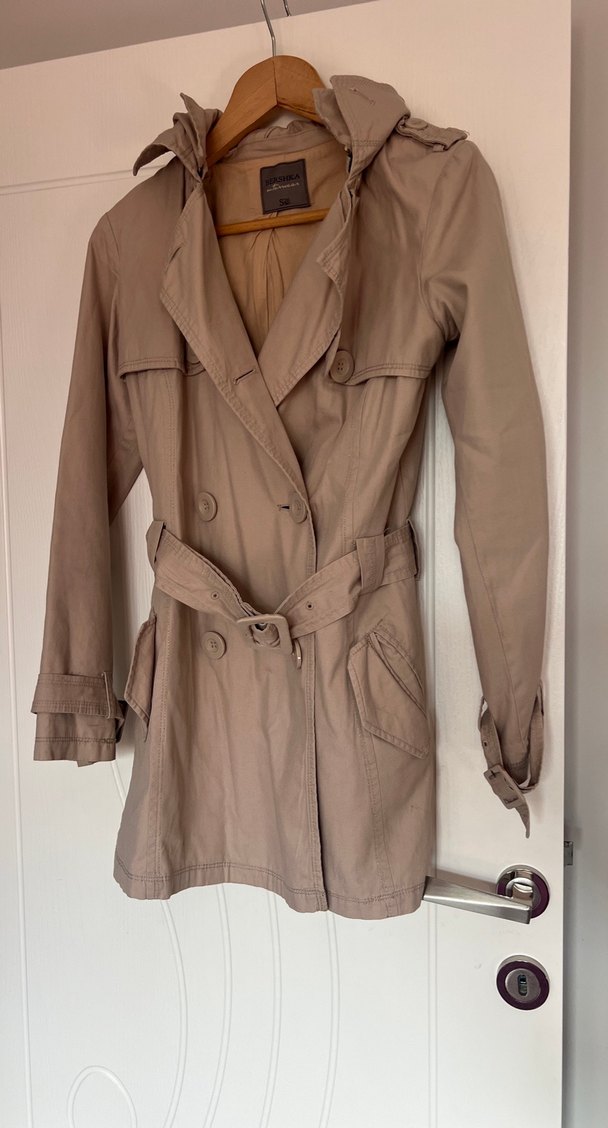Bej renkli kadın trençkot, kemerli ve keskin yakalıdır. Uzun kollu, vücuda oturan kesimi ve yumuşak sentetik kumaşıyla günlük kullanıma uygundur.