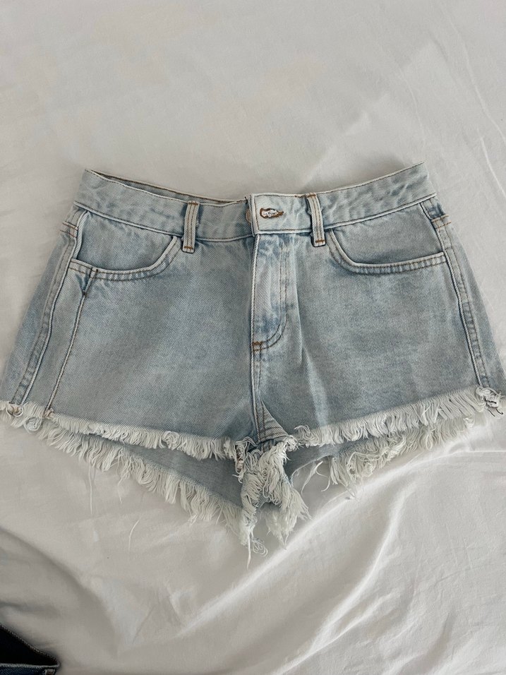 Kadınlar için bej mini denim şort, bol kesim ve püsküllü kenarlarla rahat ve şık bir görünüm sunar.