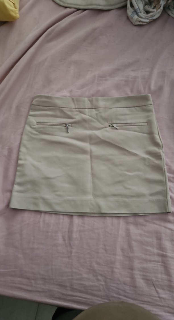 Fermuarlı cepleri ve düz bej renginde, günlük sokak stiline uygun, sentetik kumaştan dar kesim mini etek. bel ve boy uzunlukları belirtilmiştir krem rengi tonlarindadir
