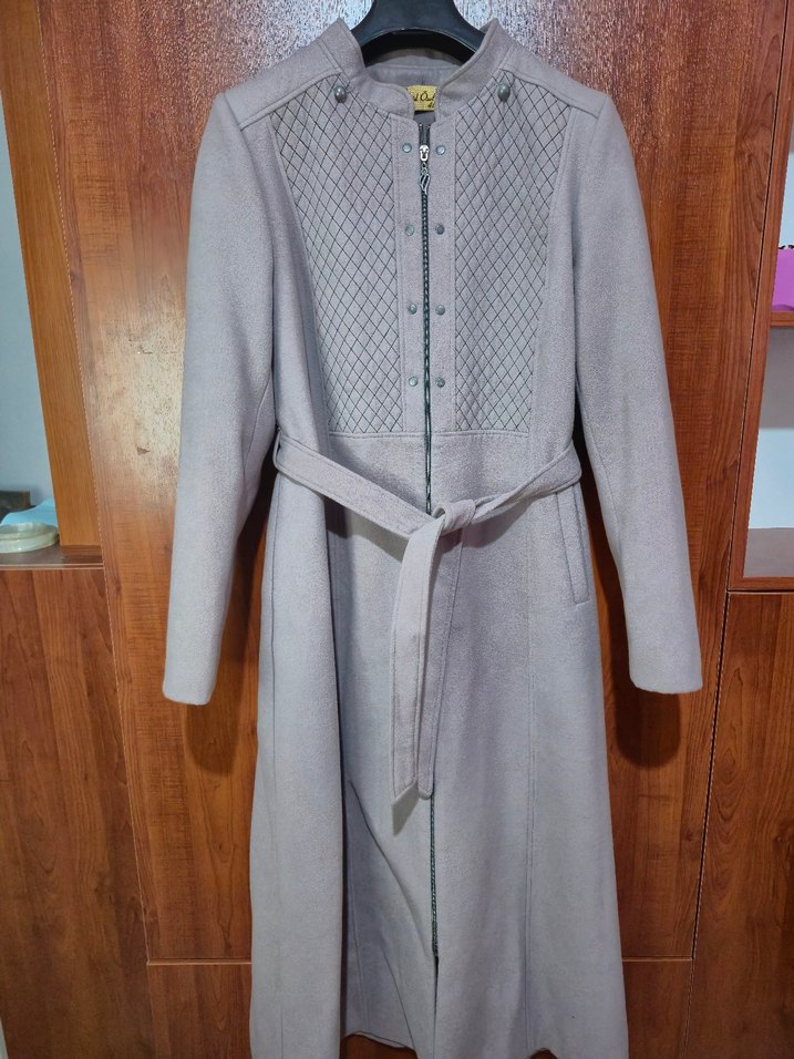 Bej renkte, işlemeli, kemerli uzun kaban. Uzun kollu, klasik kesim, yumuşak ve sıcak kumaştan üretilmiştir. Günlük kullanıma uygundur. slim fit dar kalıptır