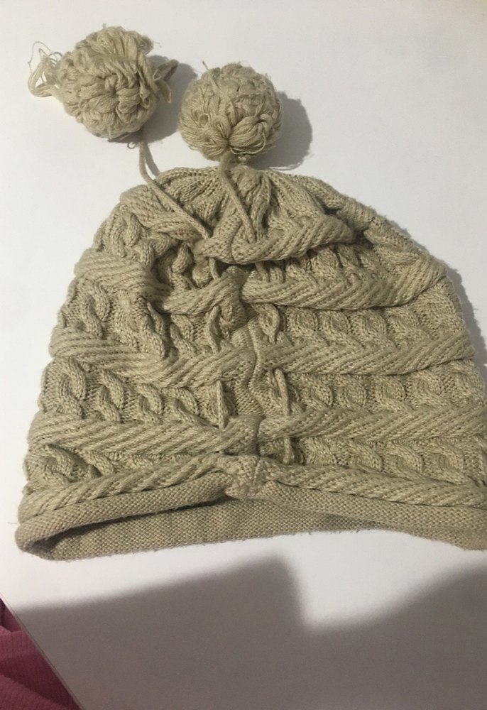Kadınlar için bej renkli, örgü kumaştan yapılmış, iki ponponlu, rahat bohem tarzda bere. Yumuşak ve sıcak dokusu soğuk havalar için uygundur.