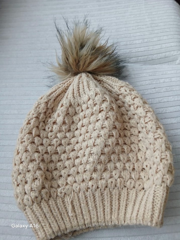 Kadınlar için bej renkli, örgü dokulu bere, yumuşak ponpon detayıyla rahat ve bohem tarz sunar.