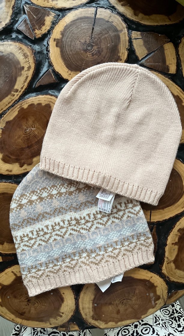 Yumuşak örgü kumaştan yapılmış iki adet kadın bere seti. Biri düz toz pembe, diğeri toz pembe ve gri tonlarda desenli, rahat bir tasarıma sahip.