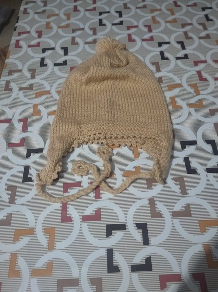 Kadınlar için açık bej renkte, örgü dokulu, bağcıklı ve bohem tarzda retro bir bere. Rahat ve sıcak tutar. bebek örgü şapka