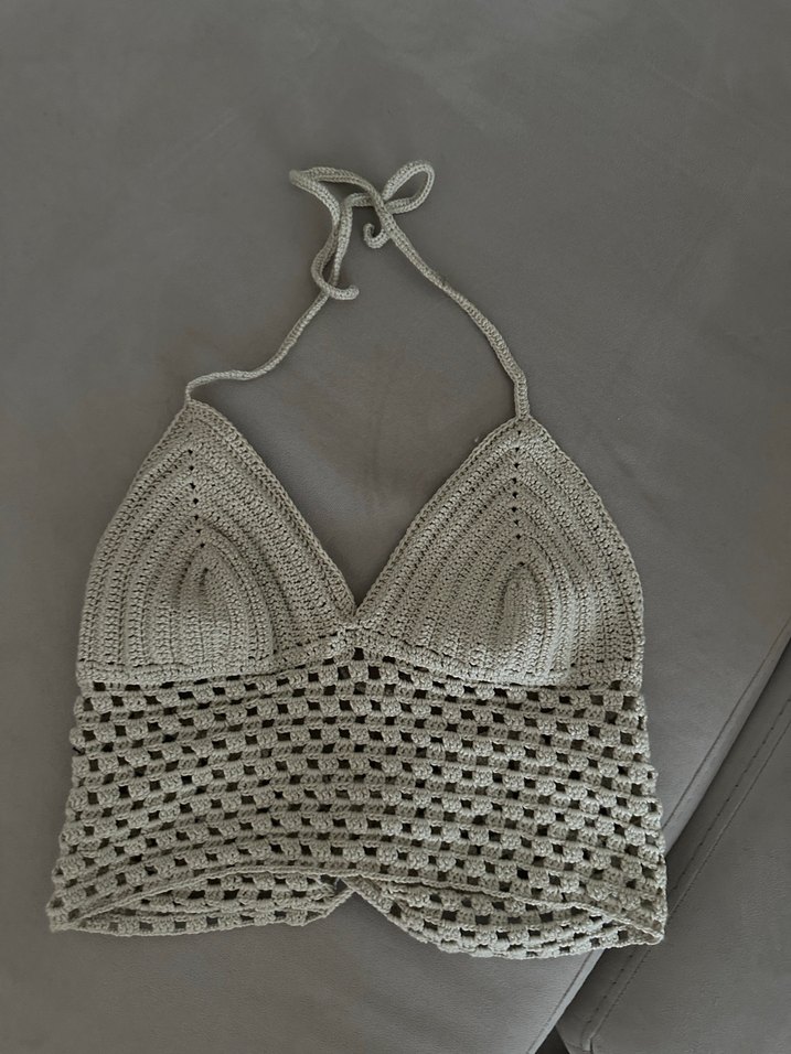 Bej renkli, V yakalı ve askılı, örgü dokulu, kısa ve vücuda oturan bohem tarzı kadın büstiyer. Günlük kullanım için uygundur.