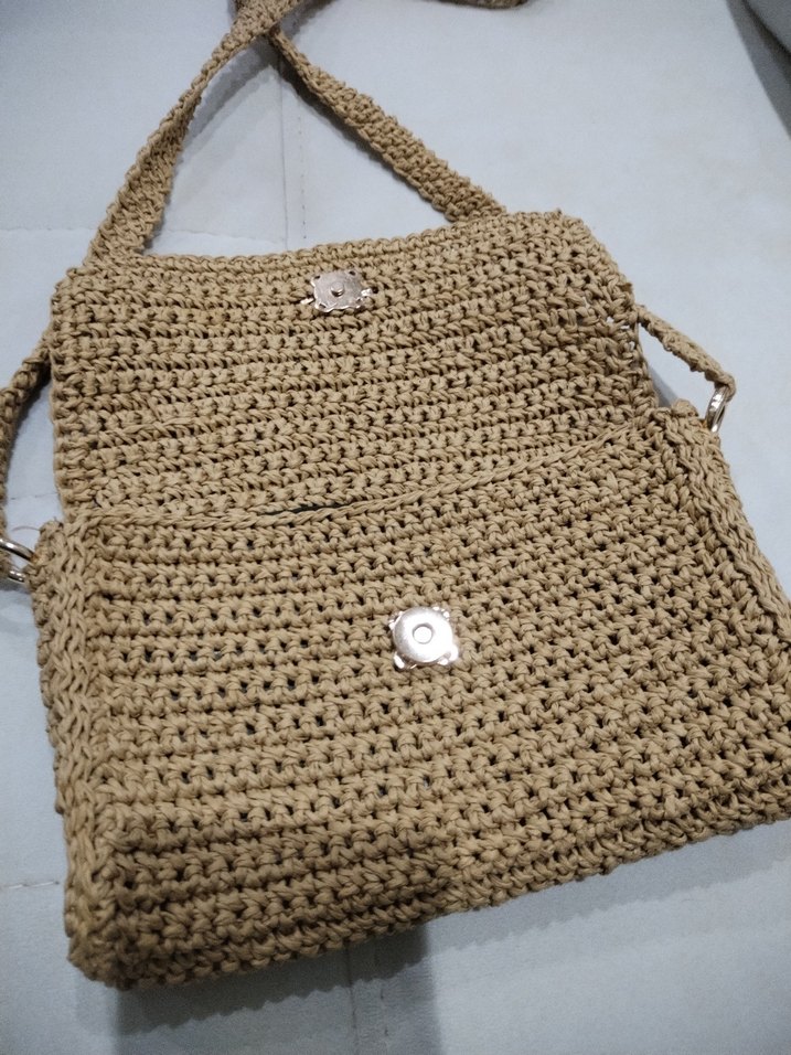 Bej renkli, manyetik kapamalı ve uzun askılı örgü kadın çantası. Günlük kullanım için uygun, bohem tarzda.