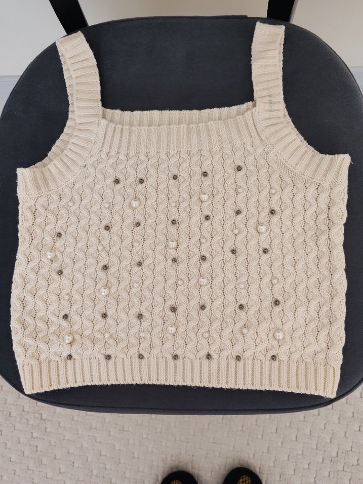 Bej renkli, yuvarlak yaka ve dar kesime sahip, ön kısmında inci ve boncuk detayları bulunan örgü kolsuz triko süveter. Günlük kullanıma uygun. Marka temsilidir