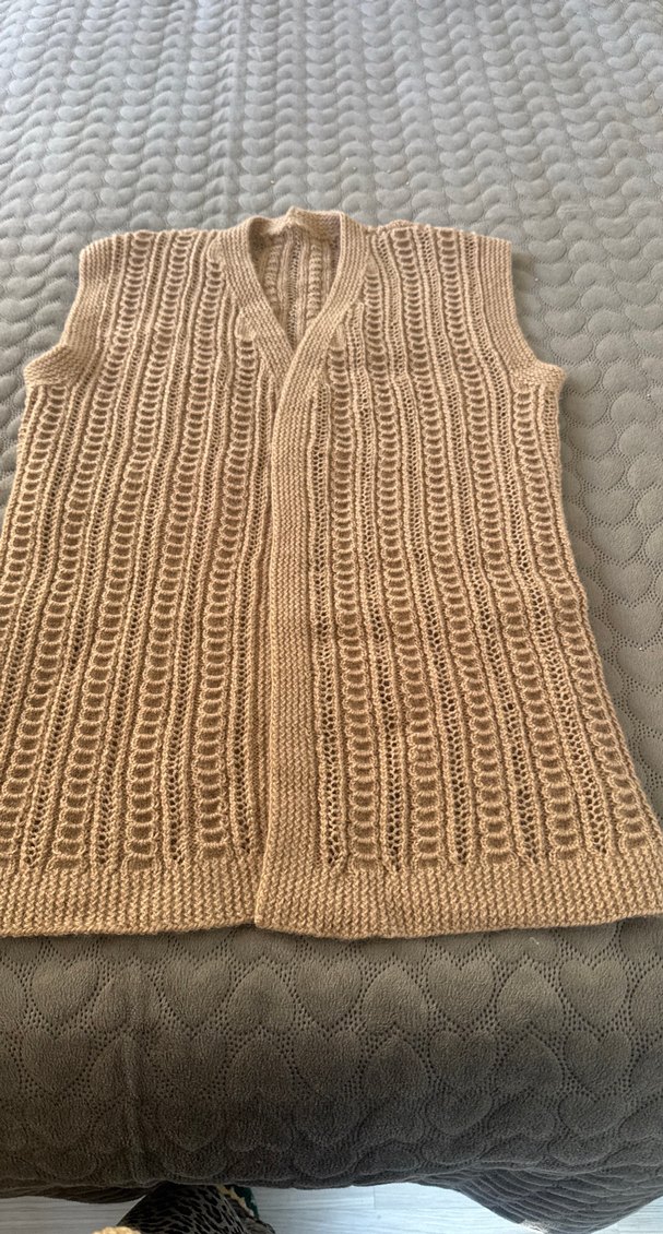 V yaka, regular fit, bej renkte, örgü kumaştan yapılmış, kolsuz, midi uzunlukta kadın süveter. Rahat ve sade bohem tarzda, günlük kullanıma uygun.