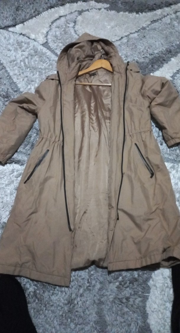 Kadınlar için bej renkli uzun kaban, bol kesim. M beden günlük sokak tarzına uygundur.