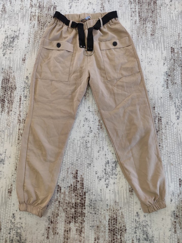 Bej pamuklu, kemerli, bol kesim, büyük ön cepli ve lastikli paçalı rahat midi pantolon. Sokak stili için uygundur.