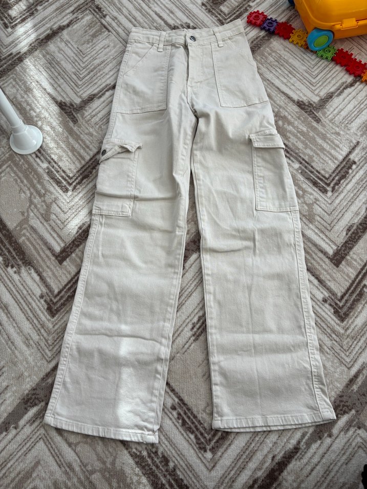 Bej pamuklu kadın kot pantolon. Bel kemerli, cepli ve desen içermeyen sade tasarım. Günlük rahat kullanıma uygundur. Bir defa kullanıldı sıfırdan farksız