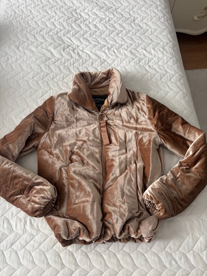 Kadınlar için bej parlak kadife görünümlü,normal uzunlukta, alt kısmı büzgülü kışlık mont.