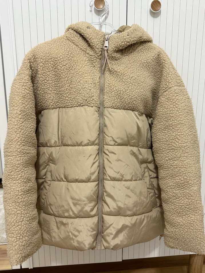 Kadınlar için bej peluş üst ve kürk detaylı, kapitone alt kısmı olan sıcak tutan kışlık mont. Uzun kollu, normal boy ve basic kesimdir.