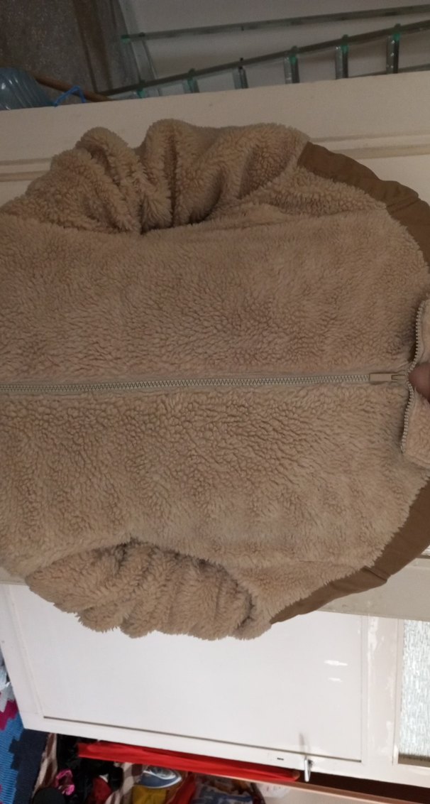 Yumuşak, peluş kumaştan yapılmış, yüksek yakalı ve uzun kollu bej kadın ceket. Kürk detaylı ve rahat bir kesime sahiptir. kolunda ufak bir delik vardır