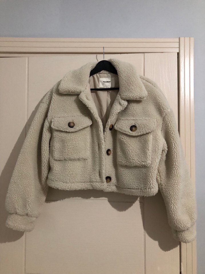 Bej renkli kadın ceketi, tüylü detaylı, yumuşak ve sıcak kumaştan yapılmıştır. Uzun kollu ve yuvarlak yakalı, bol kesim ve normal boydadır.