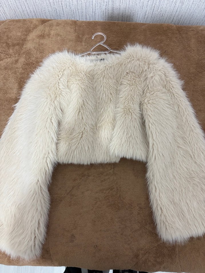 Bej renkli, uzun kollu, tek renk peluş kısa kürk ceket. Bohem ve retro tarzda, rahat ve şık görünüme sahiptir.